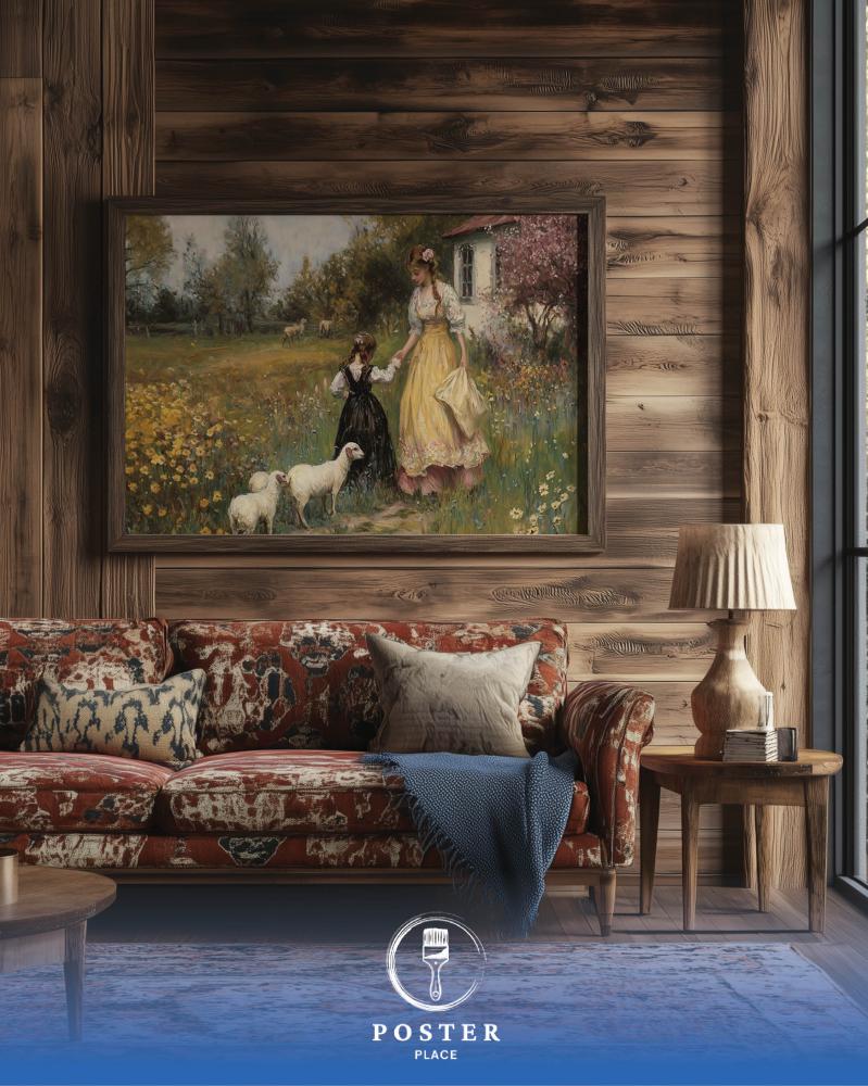 لوحة جدارية امرأة وطفلة بحقل الزهور